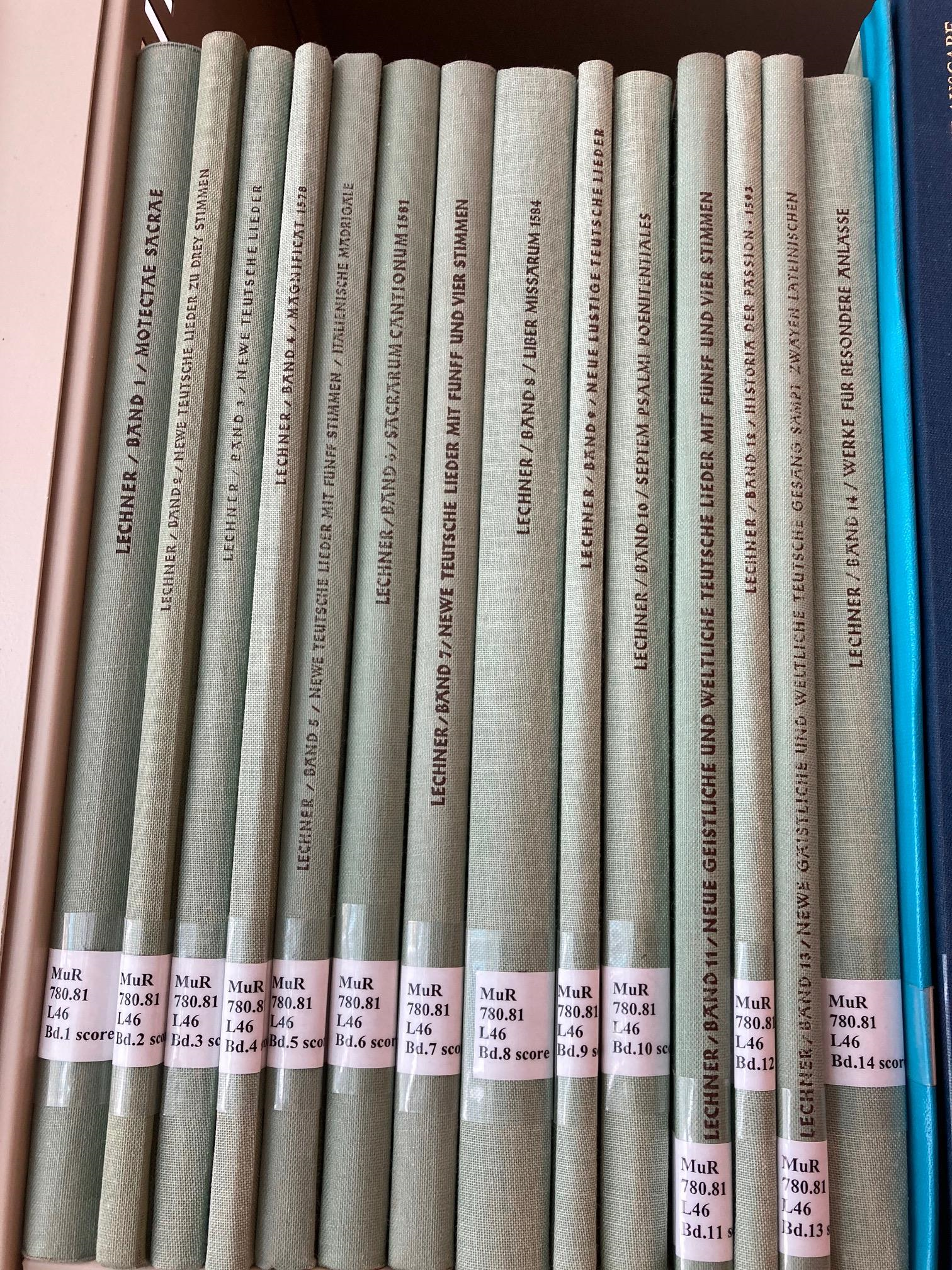 Sanctissimae Virginis Mariae canticum : secundum octo vulgares tonos, quatuor vocibus : 1578 Call Number: MuR 780.81 L46 Bd.4 score Newe teutsche Lieder : mit fünff Stimmen : con alcuni madrigali, 1579 Call Number: MuR 780.81 L46 Bd.5 score