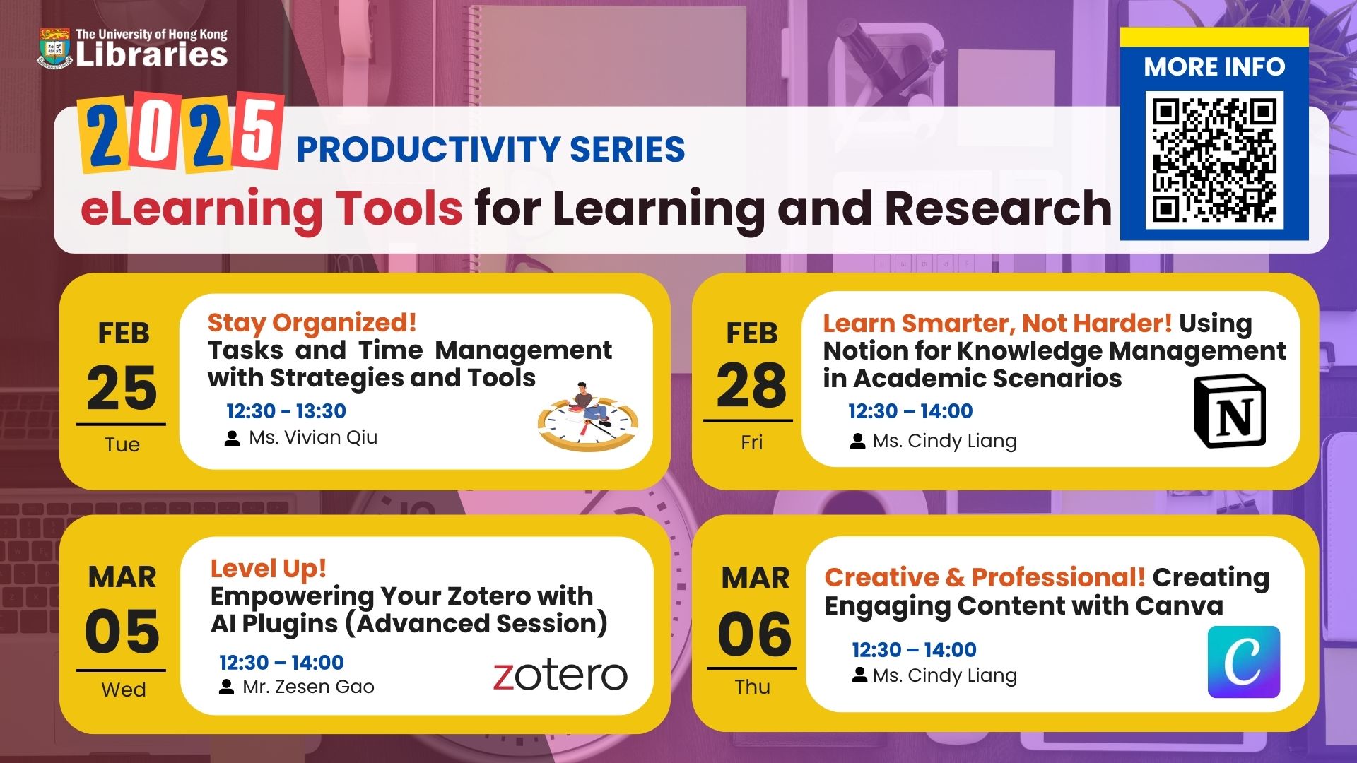 Led by experienced instructors and student representatives, this interactive and hands-on workshop series will guide you through task management, knowledge organization, citation tools, and creative design techniques. Whether you’re a research student, an undergraduate, or just looking to refine your digital skills, these sessions will empower you with practical strategies to excel in your academic journey.
