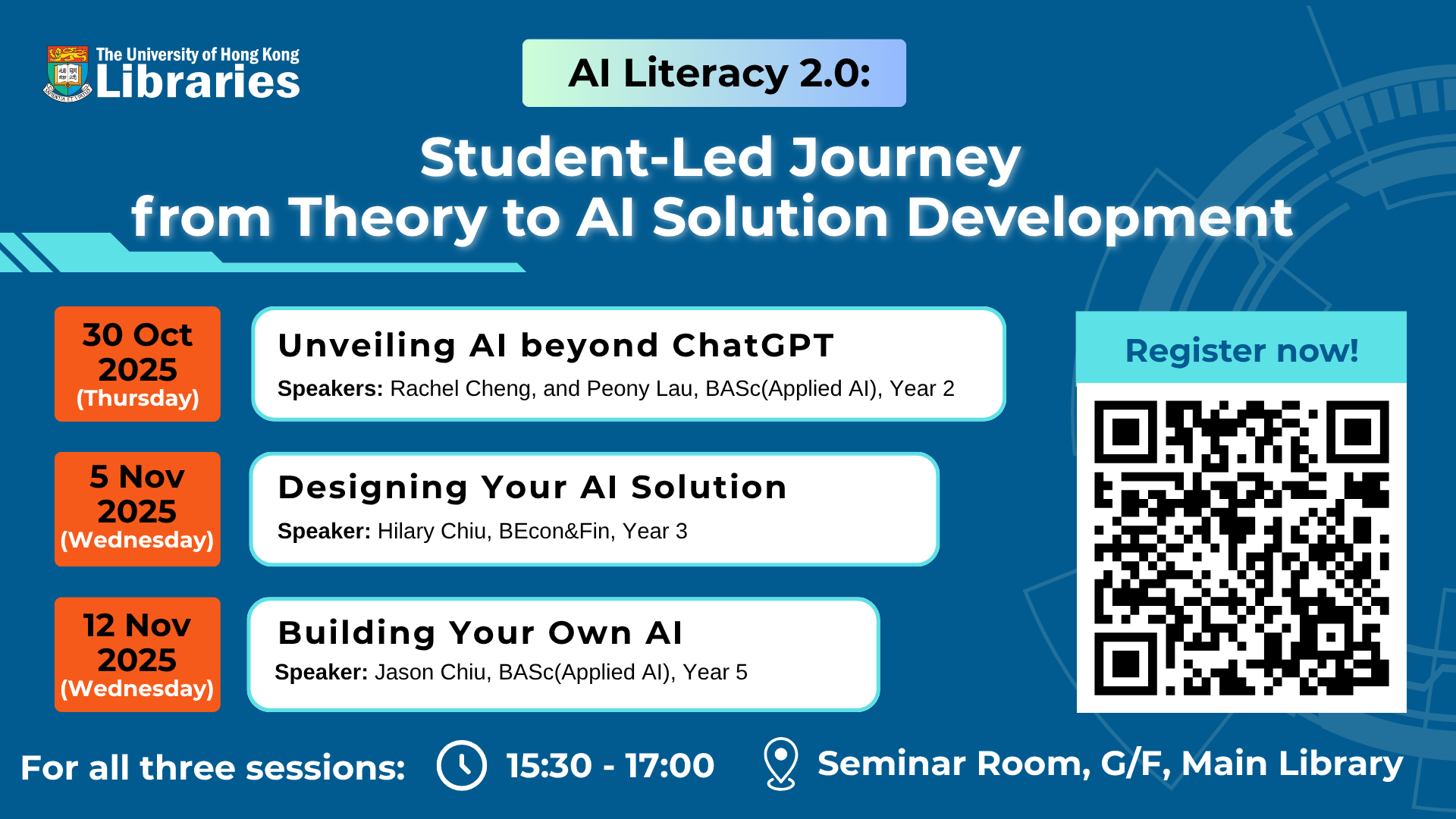 The HKU Libraries invites you to join the "AI Literacy 2.0: Student-Led Journey from Theory to AI Solution Development" series. With the training provided by student leaders from Nocodile AI, an HKU Student Interest Group, you will be able to develop a more comprehensive understanding on AI and its application. Check out the session details below.