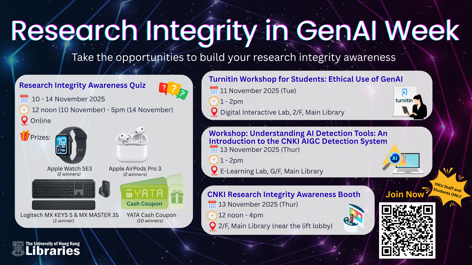 (“Research Integrity Awareness Quiz” and “Turnitin Workshop for Students: Ethical Use of GenAI” are funded by the Research Integrity Funding Scheme 2024/25 under the project title “Research Integrity in GenAI”, jointly led by the Faculty of Education and the University Libraries.)