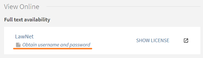 A: For certain databases, such as LawNet, eLaw.my, and Manupatra, a separate login is required in additional to HKUL Authentication. You can find the username and password in their FIND@HKUL records (as shown below) to obtain the username and password.