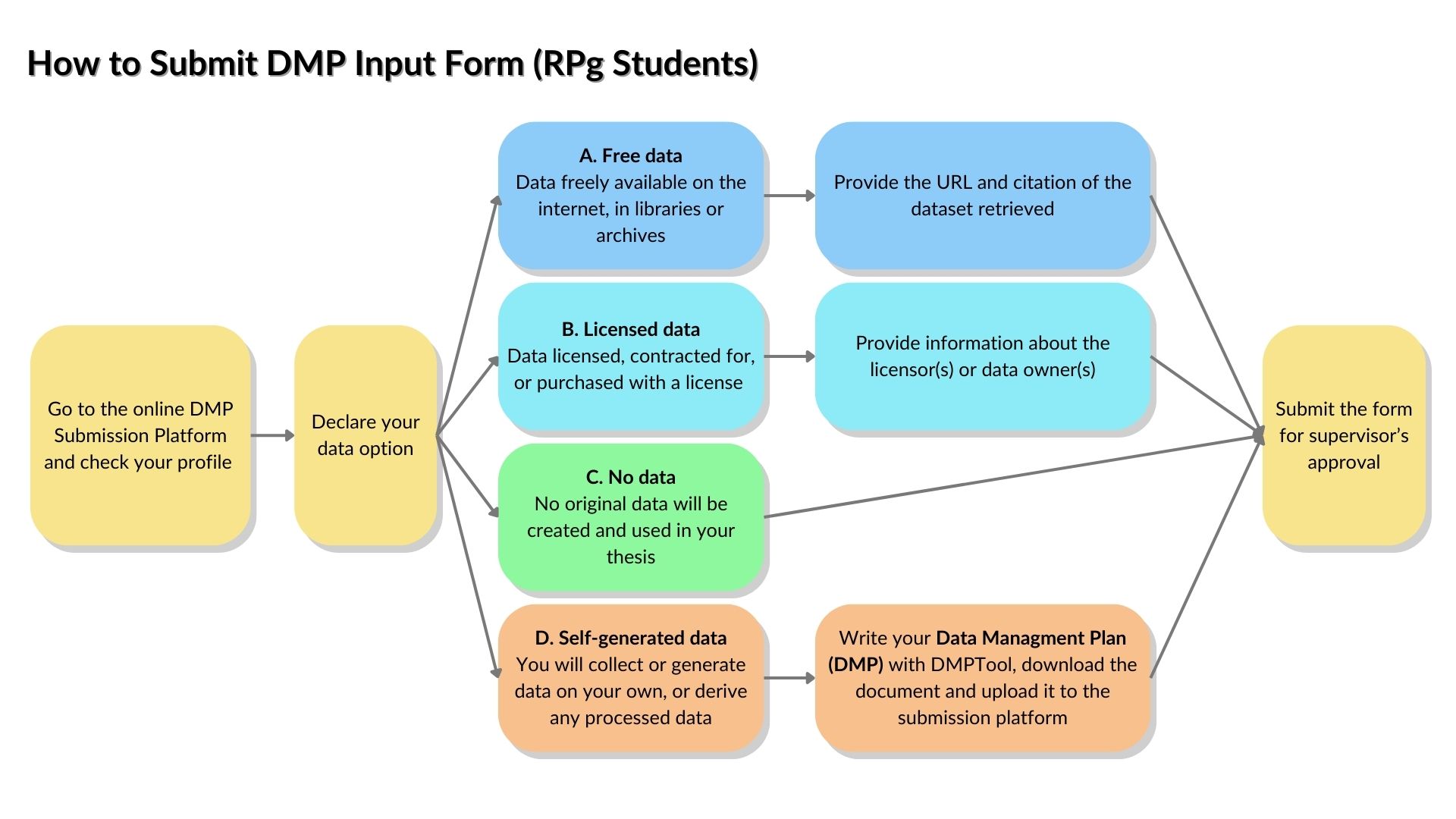As part of the candidature approval process, RPg students are required to submit the DMP Input Form to declare whether they will create a dataset and whether the datasets used should be deposited.